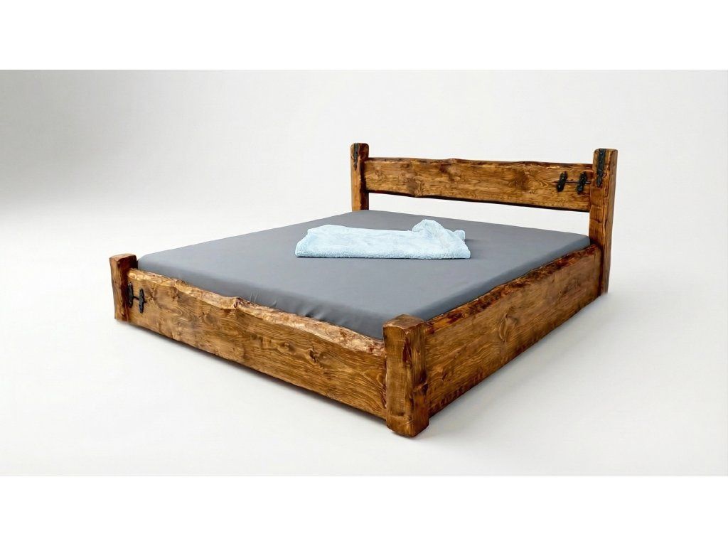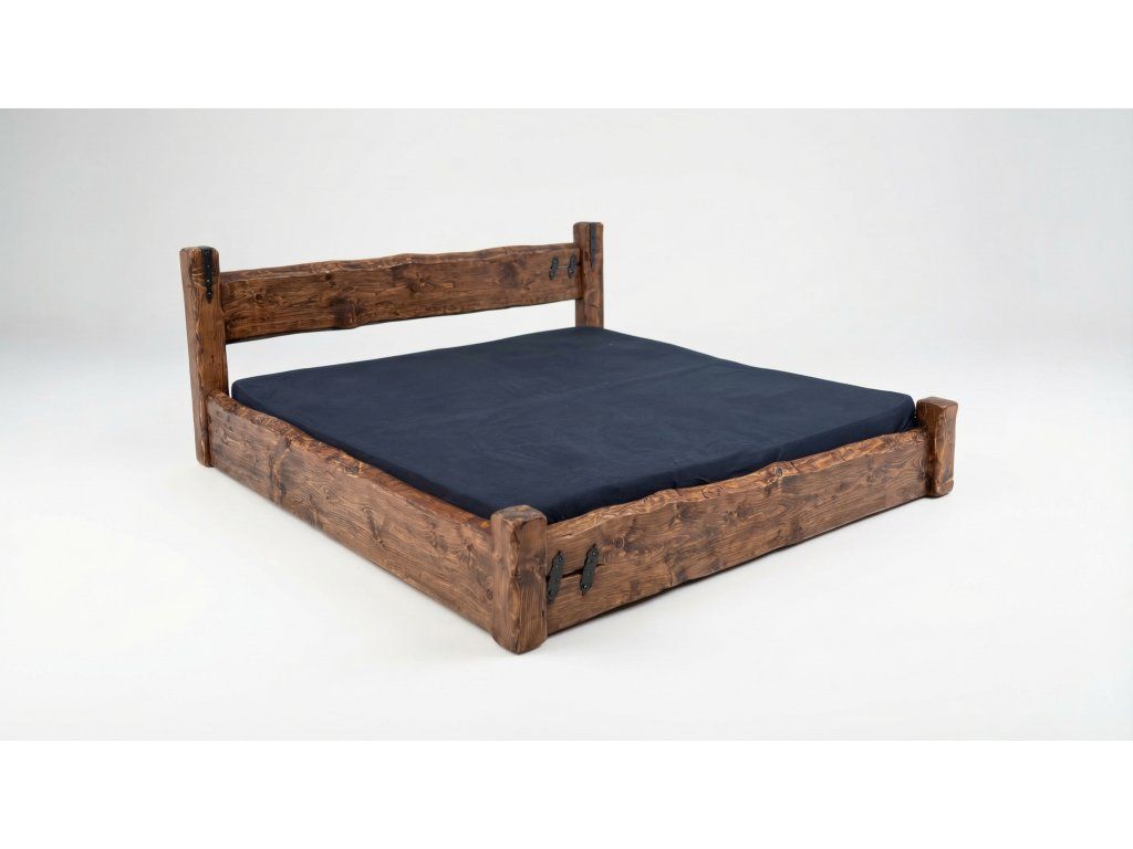 Masivní nízká postel z pravých trámů vyniká jednoduchostí a odolností. Přirozená kůra a elegantní kovové detaily podtrhují její autentický charakter.