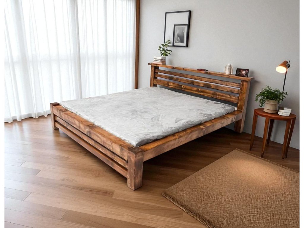 - Vnější rozměr se u celotrámových postelí navyšuje o 20 cm – např. rozměr 180 × 200 cm (vnitřní) odpovídá 200 × 220 cm (vnější).